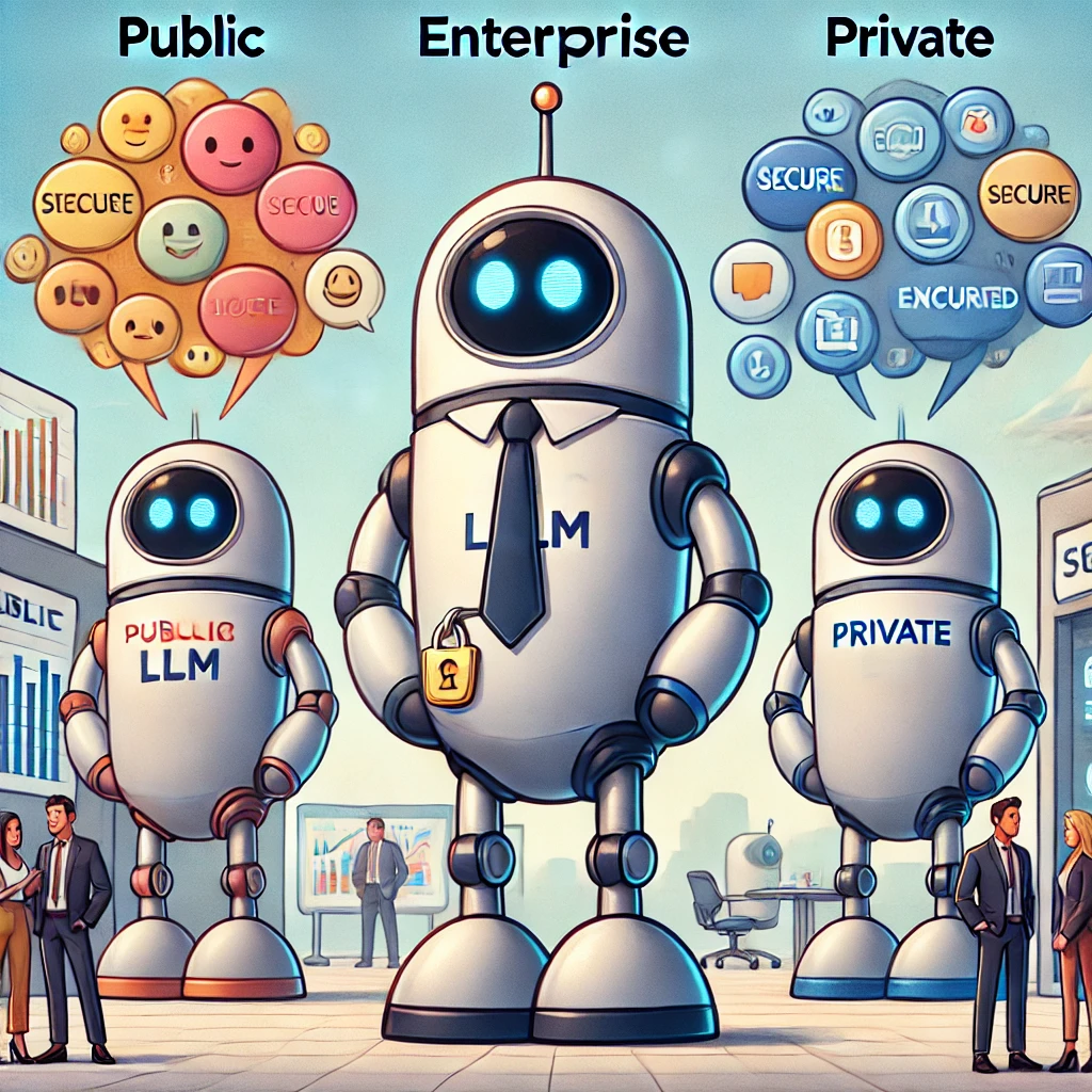 Enterprise LLMs are private alternatives to public LLMs. They are provided with privacy assurances, support, and administrative visibility.